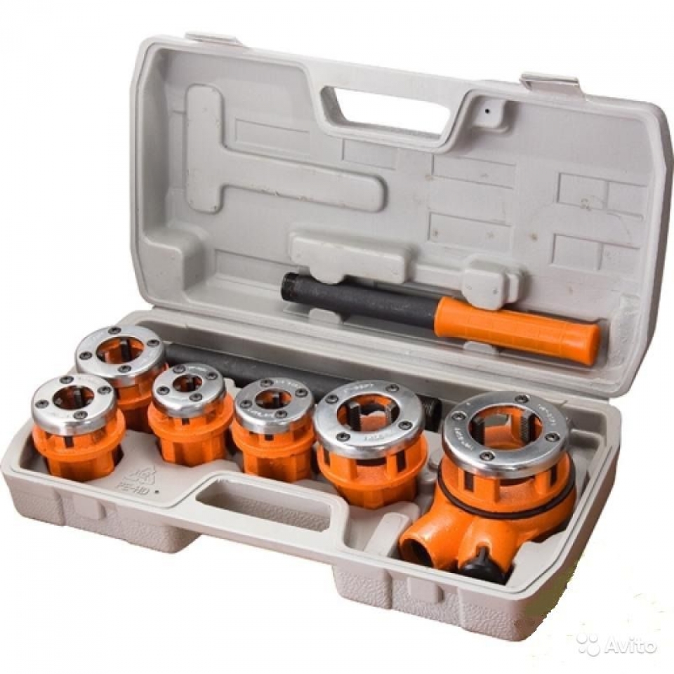 Резьбонарезной набор трубный 1/2", 3/4", 1", 1 1/2" используется для нарезания внешней резьбы на трубах круглого сечения. В набор входят три режущих головки с наиболее встречаемыми размерами - 1/2, 3/4 и 1, 1 1/2 дюйм, трещотка, увеличивающая эффективность и удобство работы.