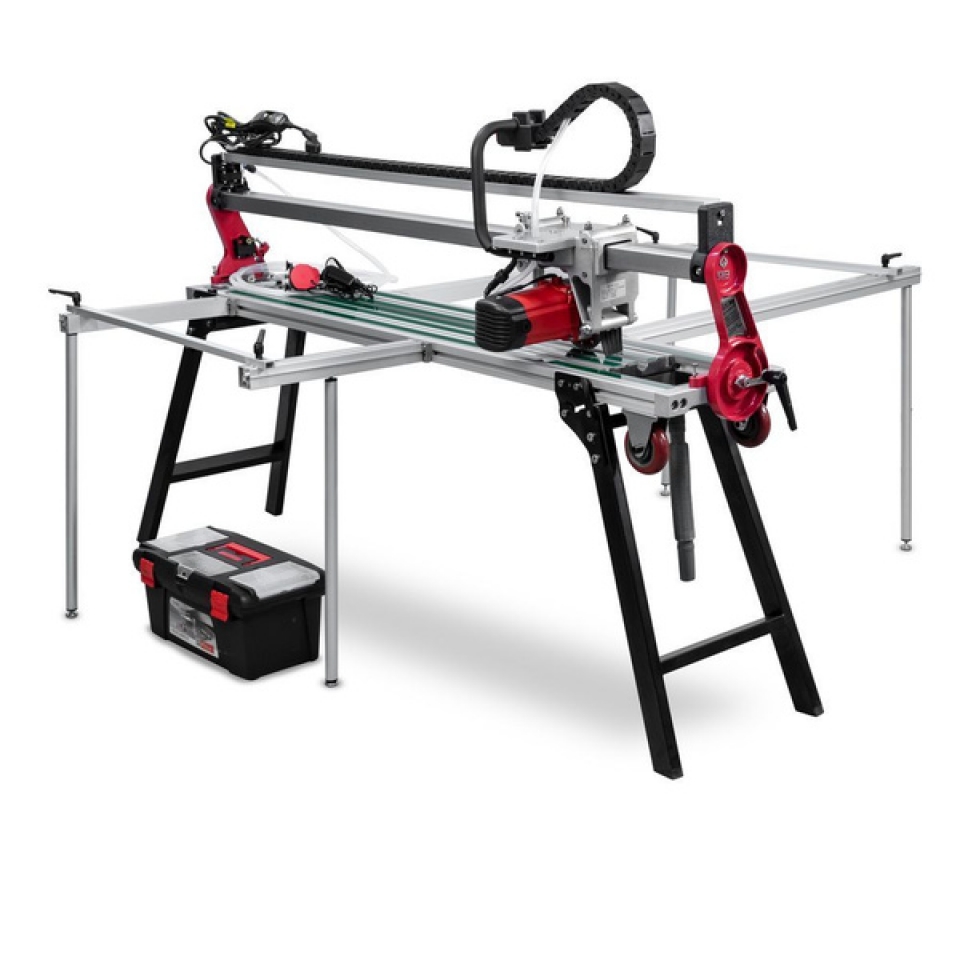 Мощный и высокооборотистый двигатель (2300Вт/13 000об.мин) дает возможность установить на плиткорез диск Ø120мм., а как известно, чем выше обороты и меньше диаметр диска, тем лучше качество реза и выше производительность. Также меньший диаметр диска позволяет более качественно и точно выпиливать в самой плитке отверстия под лючки, розетки и т.д. Большие диски используются на бюджетных плиткорезах, так как компенсируют более слабые, медленные и дешевые двигателя.